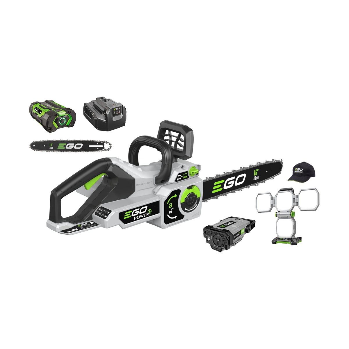 The CSLT1611E-P is a chainsaw kit bundle that pairs the EGO 40cm chainsaw with a portable LED light and power inverter, giving you a complete outdoor work solution. The chainsaw delivers the cutting performance EGO is known for, while the included light and inverter add practical versatility for jobsites and properties.