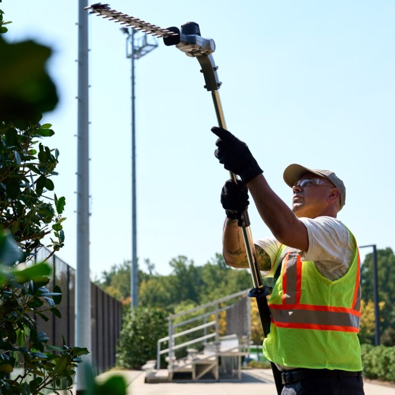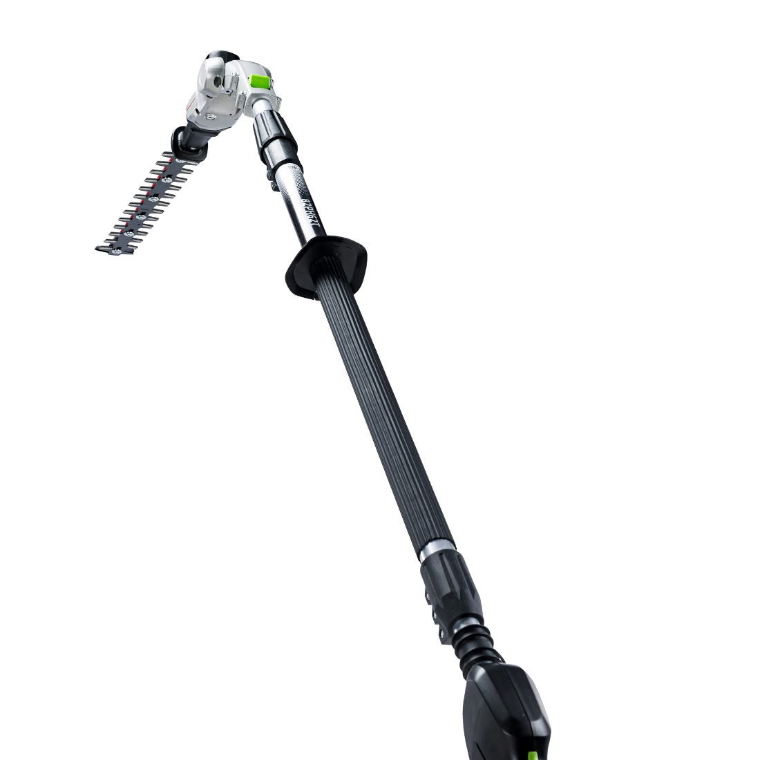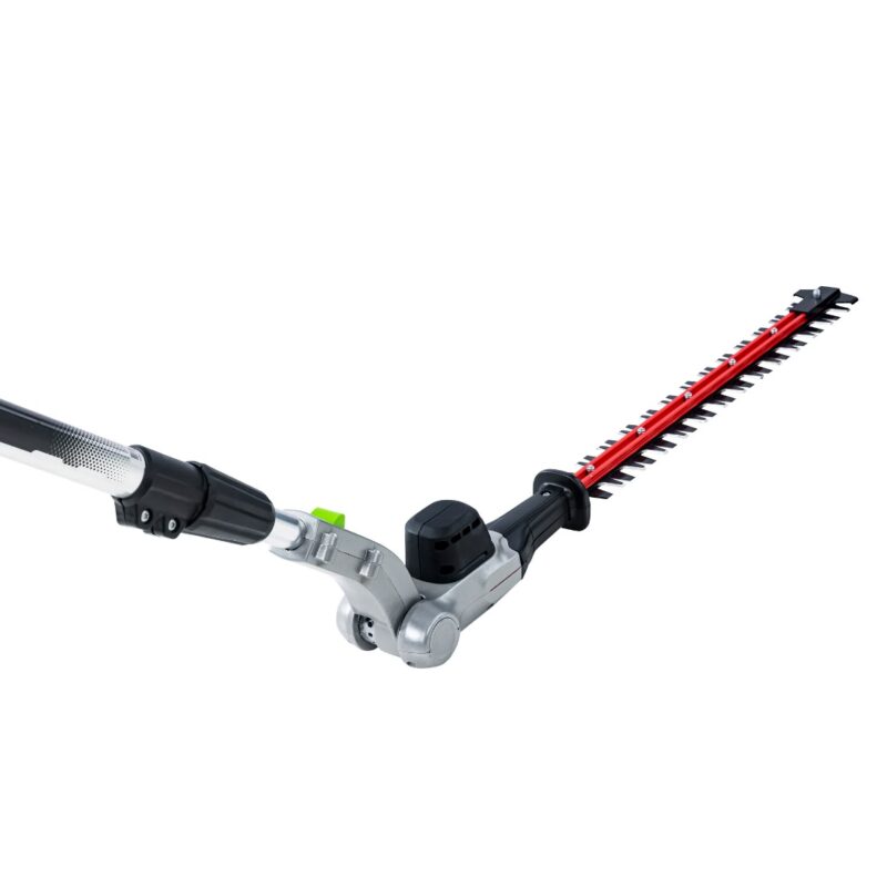 Greenworks Gen II 82V telescoping pole hedge trimmer for reaching tall hedges safely from the ground. Battery and charger sold separately.
