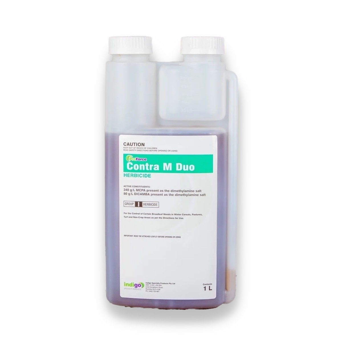 Indigo Contra M is a selective herbicide used for the control of various broadleaf weeds in turf. Containing Dicamba and MCPA, it provides effective knockdown of common lawn weeds. Important to note – Contra M is not suitable for use on Buffalo turf. For Couch, Kikuyu and other common turf types, it’s a reliable and economical broadleaf weed control option. Apply at 65 mL per 100 m².